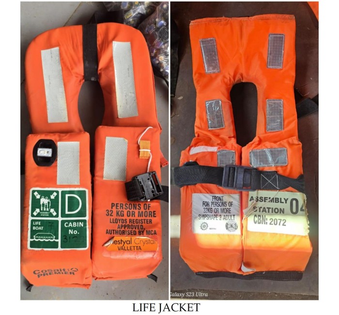 LIFE JACKET / INFLATABLE LIFE JACKET / LIFE BUOY / BREATHING APPARATUS / EEBD / ALL TYPE OF FIRE EXTINGUISHER / FOAM / IMMERSION SUIT / FIRE SUIT / CHEMICAL SUIT / STRETCHER / FIRE HOSE / NOZZLE / FIRE ALARM / SAFETY LINE / HARNESS / ALL TYPE OF SMOKE DETECTOR / ALL TYPE OF FENDERS / NAVIGATION LIGHT / FIRE SAFETY LINE / SEARCH LIGHT / FIRE ALARM / VENTILATION FAN & DUCT / FIRE BLANKET / WORKING LIFE VEST AND ALL FIRE & SAFETY EQUIPMENT'S......